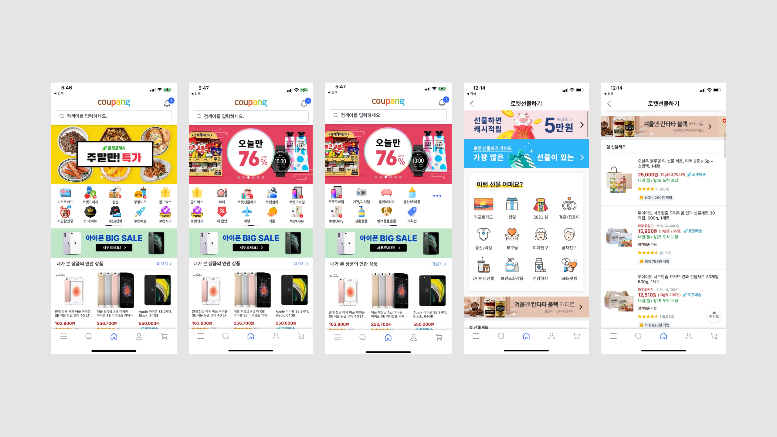 쿠팡 로켓선물하기 기능 캡쳐본 기프트카드는 메인에, 선물하기 기능은 다소 뒤쪽 슬라이드에 위치해있다는 특징이 있었다.