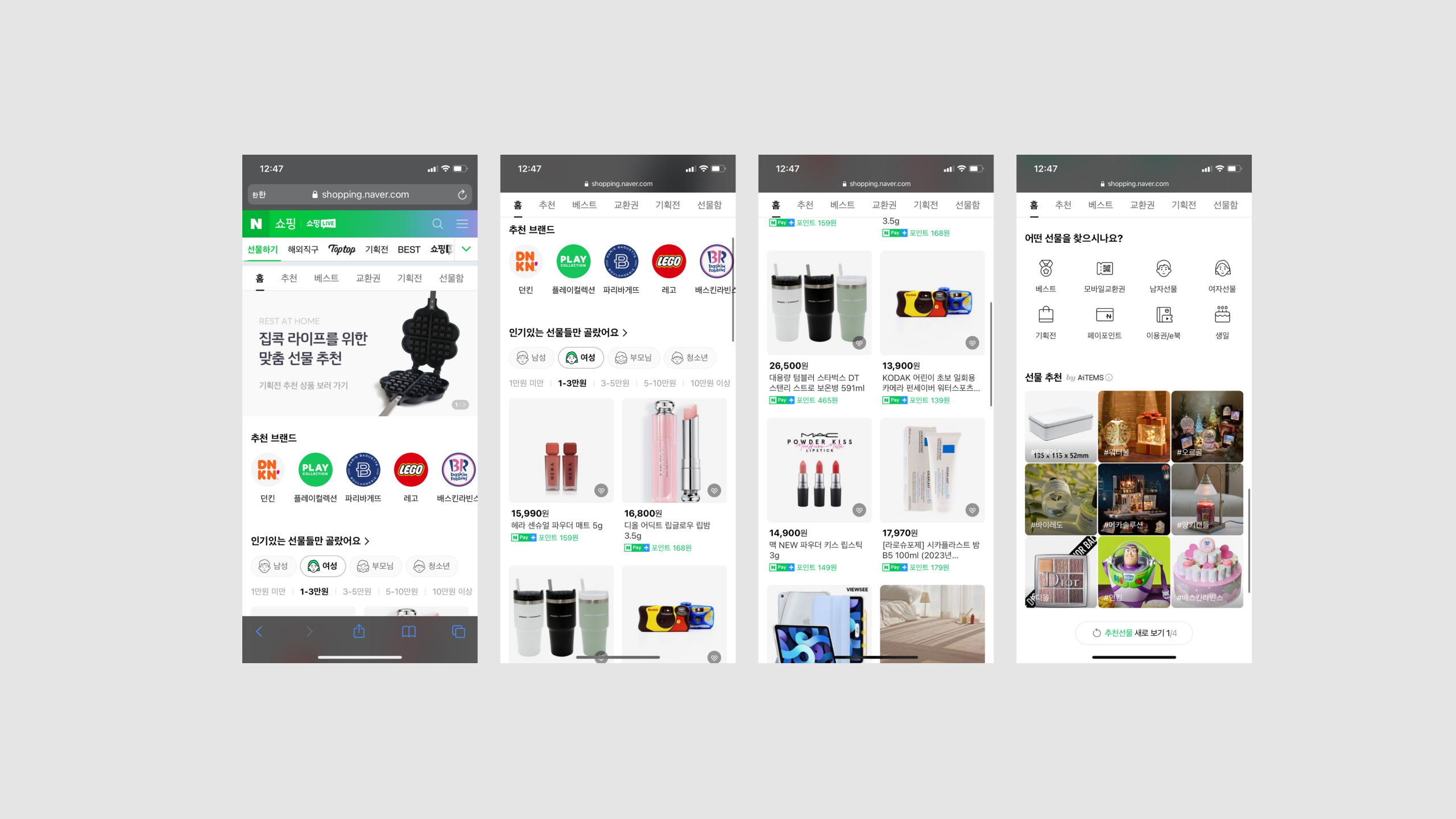 네이버쇼핑 선물하기 기능 캡쳐본 네이버쇼핑 선물하기 기능도 역시 카카오톡과 마찬가지로 성별과 비용별로 상품을 추천해준다.