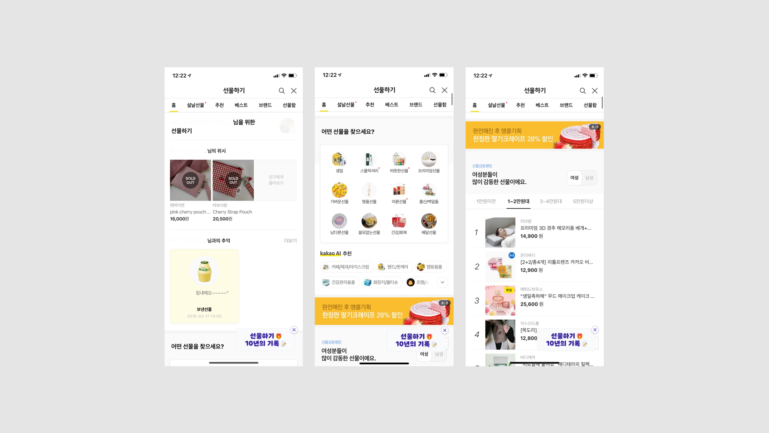 다양한 서비스에서 선물하기 기능이 등장하는 것을 보며 이제는 온라인으로 쉽게 기념일을 축하하고, 마음을 전달할 수 있는 세상이 되었구나라는 생각이 들었다. 같은 선물하기 기능이지만, 메인 서비스의 특징에 따라 똑똑하게 차별화할 필요가 있을 것이다. 추후 카카오톡의 선물하기 기능을 능가할 네이버, 쿠팡 (혹은 다른 서비스의) 선물하기 기능으로 성장하게 될지 궁금하다.