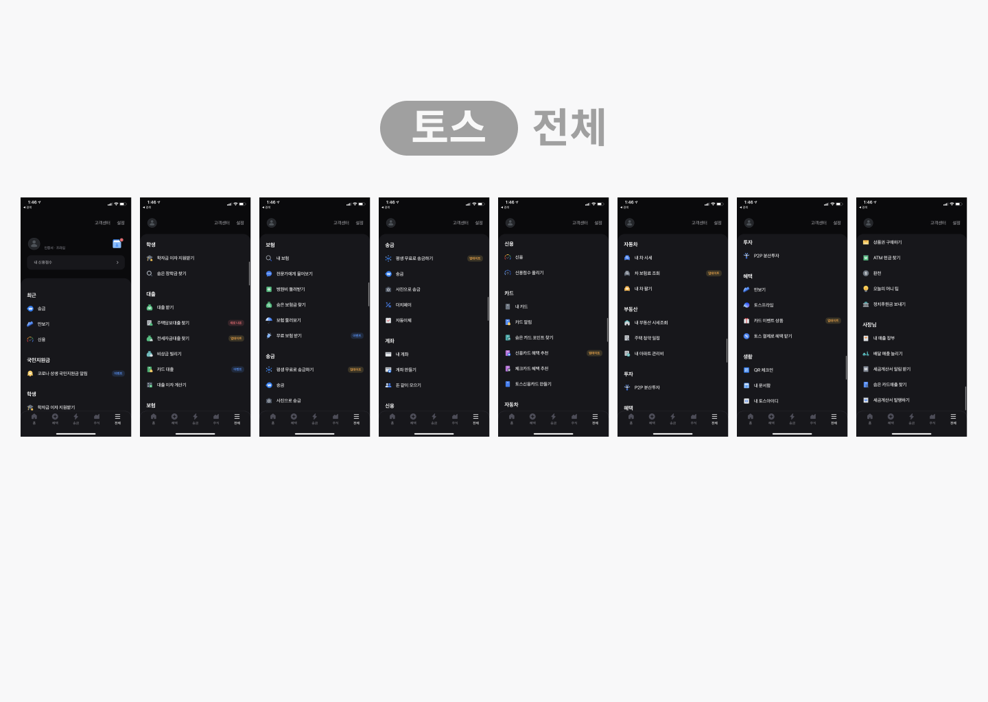 토스 모바일 앱 캡쳐화면 [전체] 하단탭의 5번째, 전체 기능입니다.