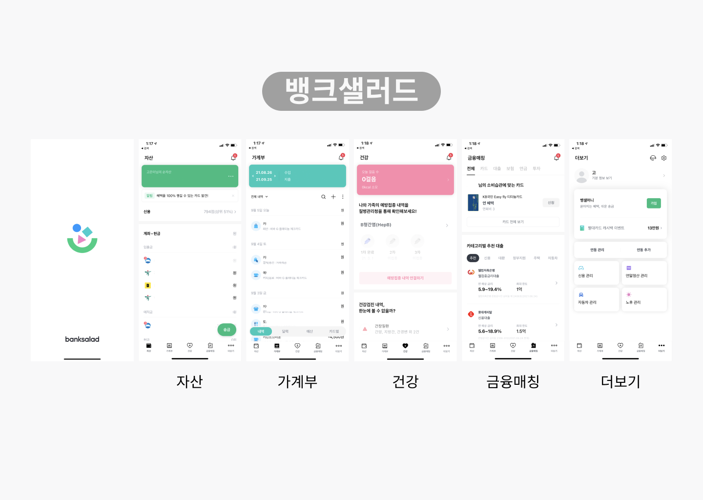 뱅크샐러드는 자산,가계부,건강,금융매칭, 더보기의 하단탭메뉴를 제공하고 있습니다.
