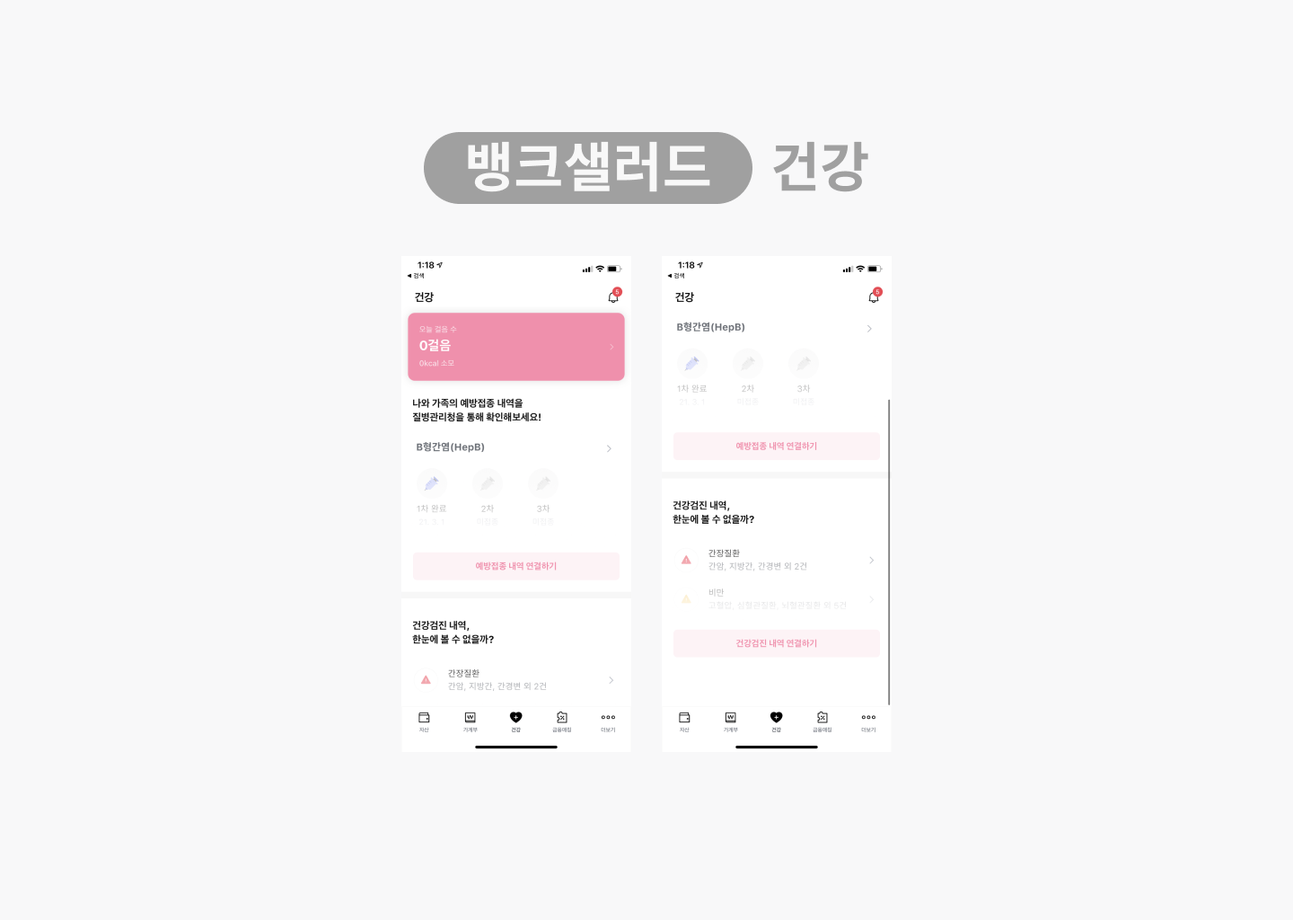 뱅크샐러드 모바일 앱 캡쳐화면 [건강] 하단탭의 3번째 위치한 건강기능입니다.